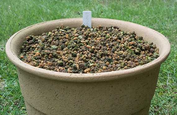 カタバミは地上部の草丈が2cmほどでも、根は地中深く6~8cmまで伸ばしています。従って”欠片も残さず”駆除しようとすれば、根の周りを竹串などでそれなりの深さまで差し、土を解してからでないと途中で切れてしまいます。注意を怠れば休眠中のニリンソウの塊根を傷付けることになり、迂闊に差し込むこともできません。発芽から僅かしか経っていない筈ですが、既に種子を結んだおマセな個体もあり(円内)、乱雑に扱うと鞘が割れてタネをバラ撒かれる恐れもあります。かなり手間取ってしまいましたが、問題のカタバミは全て、ほぼ完全に抜き上げに成功しました。数えてみると、大小合わせて24個体が確認できました。これほど深刻なものは他にはありませんが、浸食個体数3~5個のポットは両手両足を総動員するぐらいはあります。当分はこんなことで時間を潰すことになります。