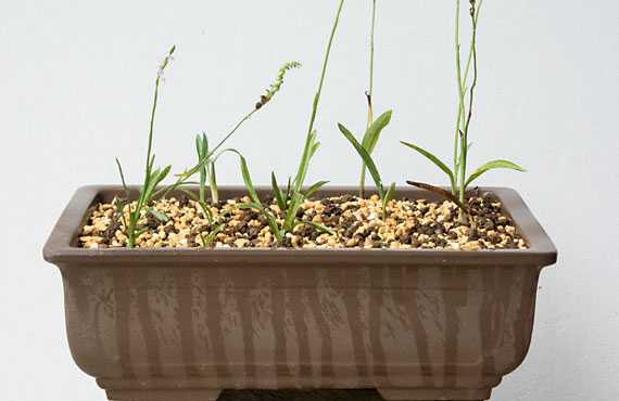上画像が他人の棲家や芝生に、勝手に根付いた一群です。今年は秋の手入れが大規模なものになるのが避けられず、少なからぬ”うっかり事故”が起こりそうです。ということで、休眠に入って各個体が姿を消す前に、先手を打って寄生したネジバナ群をピックアップし、所定の場所に集約することにしました。発生後数年が経過した準古参株は芝生の人通りのない場所に移動し、0~2年の若齢株はポットに植え替えました。下画像が集約先で、内寸17✖22cmのポットに20株を集約しました。最若齢は今年発生したばかりの0歳児から、既に花を咲かせた2~3歳児を含みます。この先、有機肥料、化成肥料を問わず、適正な施肥で促成を進め、個体数の増加を進めたいと思っています。