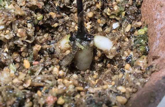 こちら が表土をめくってバルブの半身を露出させた画像右の個体の様子ですが、春先に植え付けた時には1個だったバルブが3個に増えていました。「よく頑張った !! 」と褒めてやりたい場面です。ただ、バルブ相互間はまだ固く結合しており、無理矢理引き剥がすのはダメージに繋がりそうでした。ということで、秋、涼しくなるまではこのまま放置して、自然に親子バルブが剥がれるのを待つことにして、何もせずに埋め戻しました。確認したのは2株中の片方だけですが、もう一方も少なくとも2分裂ぐらいはしているかも・・・などと、ここでも捕らぬタヌキは太り続けます。