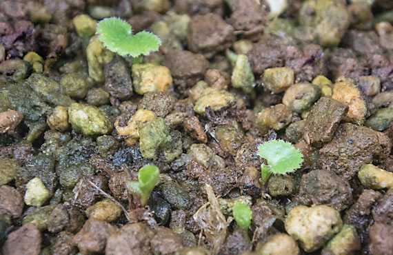上がBefore画像ですが、センターポジションで一人だけ目立っているのが、問題の白花品です。他と再び混ざることがない様、真っ先に抜き上げます。予め根の周りを竹串で解し、一気に抜き上げます。続いて他の青花品を抜き上げようとポットの表面を眺めていて、 小さな新芽 がたくさん姿を見せているのに気付きました。このポットで白花が咲くのは今年が初めてであり、しかも花後すぐに摘果したので、これらの若芽は青花品と断定して間違いありません。陣容がやや手薄になり、”絶滅”の2文字が頭でチラつくこの頃、天の恵みを得た思いです。といった状況下で、今用土更新など行えば、小さな新芽は一たまりもなく全員討ち死にの恐れがあります。