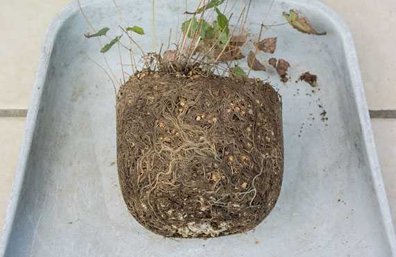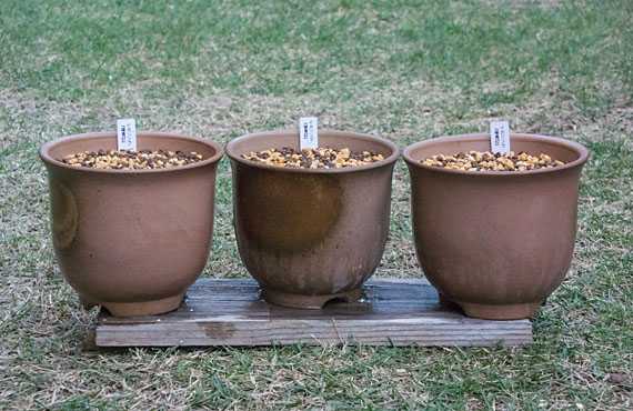 まずはポットから株を掘り上げます。 こちら が掘り上げたままの様子ですが、甚だしく根が回ってしまい、鉢底石まで抱き込んでしまっていました。網の目の様に絡んだ根を、竹串で解すのですが、この作業には予想外に時間を取られてしまいました。続いて、何とか塊茎のくびれを見付けて3つに分割しました。これらを同じ3.5号陶鉢に、新たな用土で植え付けた様子が こちら 。肥料は用土に化成肥料を適量梳き込んだだけですが、半月ほど様子を見て、発酵有機肥料を補充する予定です。尚、これらが全て無事に定着すれば、単一品種で6鉢になります。そんなに多数は必要ないので、その場合は里子として提供することになります。この品種は”キレイ”、”カワイイ”という評判で、声をかければすぐに引受先は決まるかと思います。