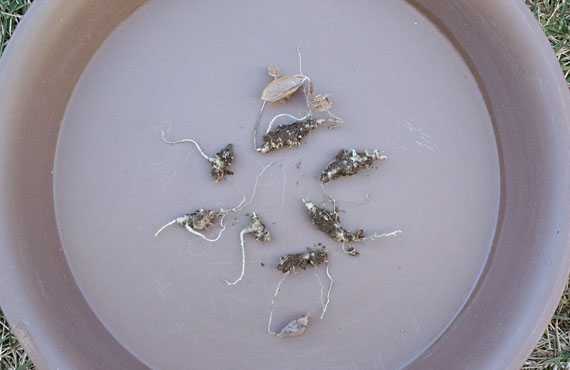 まずは地中の”芋”の掘り上げです。予想に反して用土の劣化は進んでおらず、2年経った今もフカフカを維持していました。掘り上げた芋が こちら で、大きさはピーナッツ大といったサイズでした。これを新しい用土で6号浅鉢に植え付けて 一件落着 です。多分1年ほどで浅鉢には収まらなくなろうかと思います。来秋には更に大きく深いポットに引越す必要に迫られそうです。うまく行けばその翌春には仏炎苞が見られる様になるのでは・・・などと期待しているのですが、さて、どうなることやら・・・