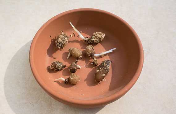用意した新居は浅型の5号陶鉢です。用土は昨年に準じてミズゴケを細断したものと赤玉土を、ほぼ半々の割合で混合したものです。8球と1粒(極小バルブ)をほぼ均等に割り付けて、1cmほど覆土して 作業を終了 しました。取り敢えず今暴れている寒気団が通り過ぎるまでは屋内で過ごさせ、その先は芽出しの状況や気温の動向を見て決めることにします。
