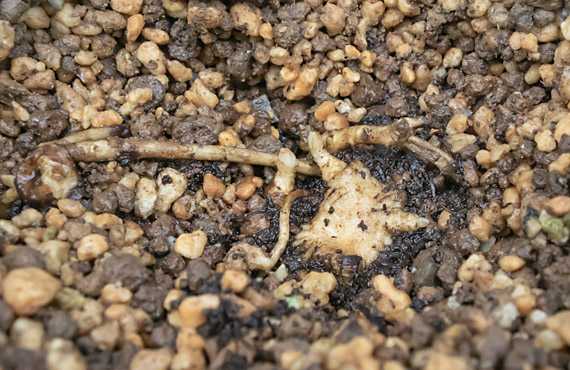 竹串で表土を解し、アイスクリーム用スプーンで用土を掻き出しながら、2cmほど掘り進めたところで塊根に行き当りました。 塊根 の色合いは新鮮な褐色です。小さいながら冬芽に進行しそうな突起も確認できます。心配していた様な「枯死」という事態は何とか免れた様です。この春、この個体は作落ちしましたが、この様子なら来春には初花を見られるかもしれません。ということで、元通り用土を被せて作業を終了しました。