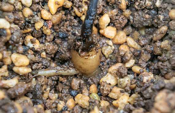 枯れ残った葉柄を辿って表土を剥がしていくと2cm弱掘り進めてところで塊茎に行き着きました。塊茎の他に根にも光沢があって、枯れてはいないことが見て取れました。枯れたのは葉っぱだけだったことが早々と確認できたのですが、冬芽は手付かずの状態でした( こちら )。結論をまとめると、①個体としてはまだ生きているが、②来年に向けての冬芽はまだできていない、という2点だけです。この先3ヶ月ほどで冬芽が生成できれば、来年に向けて命を繋ぐことは可能ですが、これができなければ冬の間に塊根は腐敗して一巻の終りになってしまいます。ということで、自動潅水の優良席をあてがい、延命措置を続けることにします。