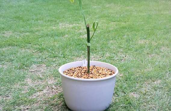 用意した新居は6号プラ鉢。植え付けを済ませた様子が こちら です。自分自身の体を維持できるまで根が発達するにはかなり時間がかかりそうです。2年で花が見られる様になれば上出来・・・なのですが、果して・・・・