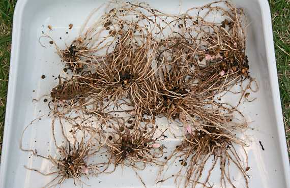 先ずは変色した表土を掃き捨てた上で休眠中の苗を掘り上げます。 こちら が掘り上げた塊茎の全量ですが、いずれも逞しそうな冬芽を携えています。塊茎の個体数は大きくは増加しておらず、この量なら上手く再配置すれば全量を元の7号ポットに植え戻せそうです。