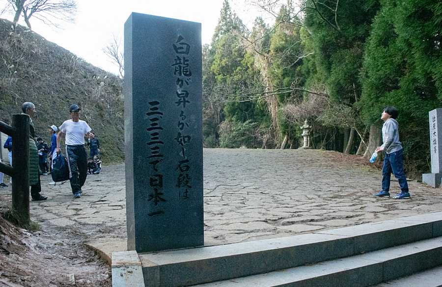 さて、上画像は階段入口の様子、下画像は最上段まで登り切った場所に立てられている石碑です。この他に100段毎に段数を告知する石碑が立っていて、今自分がどの辺に入るかを知ることができます。階段の高さは16~17cmと見積もりましたが、生憎スケールを持ち合わせていなかったので正確性には欠けることをご理解ください。