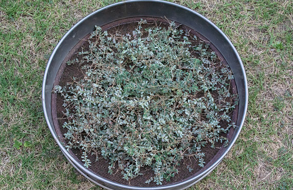 で、早速草抜きです。長期間雨が降っておらず芝生の下地はカチカチに固まっています。単純に茎を持って抜き上げようとしてもプチプチと千切れるだけで、これだと残った茎や根から新芽がでてしまい、敵は一向に減ることはありません。根まで抜き上げるには草抜き器具で根の周りの土を崩してから抜き上げる必要があります。こうした手間のかかる作業を2時間ほど繰り返して、芝生の半分、8平米を片付けました。抜き上げたスベリヒユの全量が こちら です。容器として使ったフルイは40cm径、積み重なったスベリヒユはザッと5cmあります。残る半分の芝生も、花が咲き種子が実る前に全滅させるつもりです。