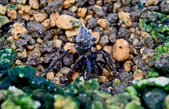 地中の様子を確かめて、結果に応じて適切な待遇に切り替えることにしました。表土を1cmほど掘り上げると、半ば炭化した株が現れました( こちら )。冬芽は生成に取り掛かっていた様ですが、途中で止まっています。また根はそれより幾らか遅れてダメージが広がった様で、株元は炭化してブツ切れしていますが、先端部は生体の色を留めています。結論としては、回復不可能なダメージです。この品種は複数のポットに分植していたので、品種として、来春に向けて望みがなくなった訳ではありませんが、あと1ヶ月、今の暑さが続けば、被害は更に広がる恐れもあります。