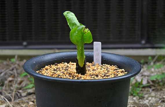 で、早速植え替えです。用意したポットは6号プラ鉢です。店主の話ではポット植えにするならできるだけ大きいポットを・・・とのアドバイスを頂きましたが、酷暑の夏場を屋内に退避することを想定すると6号が限界です。ということで植え付けを済ませた様子が こちら です。途中での枯死がないことを祈りつつの同居のスタートです。