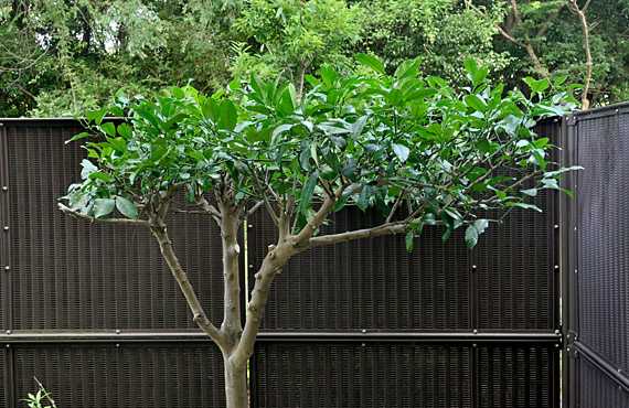 上画像が前回の終了時の様子です。中央部の最も込み入った部分の枝葉を間引きし、続いて頭頂部の向って右半分を中心に20cmほど刈り込みました。 こちら が仕上がり状態ですが、今回の措置で臨戸への領空侵犯は回避できたし、樹下の「昼でも薄暗い」という問題も軽減できました。