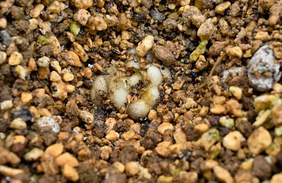 竹串で表土を解し、竹べらでその用土を掻き出す、という作業を続けます。因みに、竹串と竹べらは焼鳥の串を加工して手作りしたものです。春先の植え替えの際、いつもより深めに植え付けてしまった様で、鱗茎の頭部に行き当るのに2cm以上も掘り進めることになってしまいましたが、掘り当てての診断は、特段の問題はなく、夏場の酷暑も何とか凌ぎ切った様です。 こちら がその様子です。半年と少し前に植え付けたばかりなので、用土の疲労などは考慮の必要はなく、元通り埋め戻して「一丁上がり」としました。次なる試練は冬場の冷え込みです。何とかお手柔らかに願いたいものです。