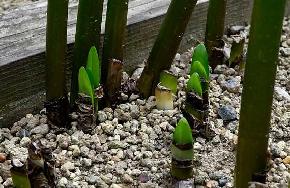 これらの2品に共通しているのは、今、葉を出しているのは、この秋花を咲かせなかった個体だけです。花を咲かせた個体は、今は花軸や花の残骸処理で手一杯で、葉っぱにまで手が回らない・・・と言っては不穏当ですが、この花軸の位置から葉を出す関係で、葉っぱを出そうにも頭がつっかえて身動きが取れない・・というのが正しい解釈かもしれません。