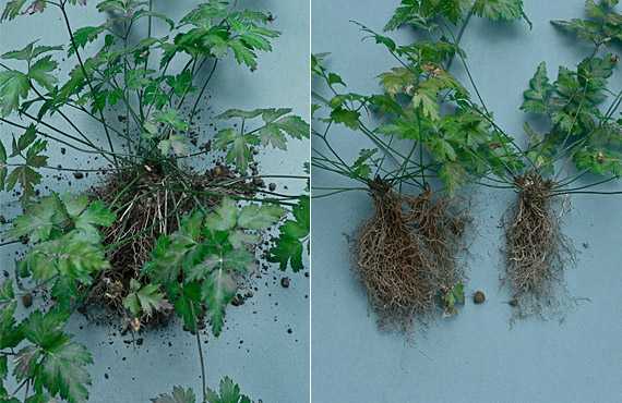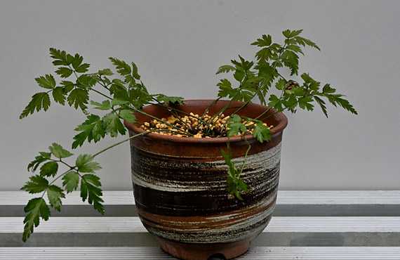 で、早速株を掘り上げた様子が こちら です。左が掘り上げたままの様子、右がそれを分割した様子です。塊茎の構造的なバランスが、ちょうど半々・・・という訳に行かず、2対1ほどになってしまいました。2の方を露地に植え戻し、残る1をポットに植え付けました。その様子が こちら です。双方とも、何とか無事に定着して貰いたいものです。