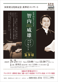 七夕の日、萬翠荘の国重要文化財指定を記念した智内威雄(ちない たけお)のコンサートに行った。智内さんは左手のピアニストとして有名な人。画家の父親と声楽家の母親のもとに生まれ、三歳から母にピアノを習い始める。幼い頃は、毎朝5時から3時間の練習をし、それから幼稚園や学校に通ったらしい。本人によると、ピアノを弾くとみんなが喜んでくれるので、それが嬉しくて練習は少しも苦でなかったという。ドイツのハノーヴァー音楽大学2回生のとき、右手にジストニアを発症する。将来を嘱望されていただけにショックは大きく、「洋服は着ているものの中身は空(から)だった」とそのころを回想している。今は精力的にコンサート活動をする一方、「左手のアーカイブ」プロジェクトの代表として過去の音楽作品の中から左手の楽曲を発掘したり、左手だけでピアノを演奏したい人のために練習曲などを作っているという。よく子供は親を選んで生まれてくるというが、「情熱さえあれば何とかなると思っている。 芸術で飯が食えないなんてことはない」そう言ってのける父親の存在は心強かったと思う。日本はもとよりヨーロッパをはじめ世界で認められる父親・智内兄助だからこその言葉。もう一人、左手のピアニストとして有名な方に舘野泉(たての いずみ)さんがいる。舘野さんもヨーロッパを中心に活躍するピアニストだが2002年に脳溢血で倒れ、右手が使えなくなった。その後、いろいろな作曲家が舘野さんに左手の楽曲を提供し、演奏活動を続けている。最近で言えば、NHK大河ドラマ『平清盛』のテーマ曲を演奏されている。世界に二人しかいない左手のピアニストがともに日本人で、一人は過去の音楽を振り返ることで、もう一人は新しい音楽を生み出しながら、新しい分野を開拓しているのが逞しい。肝心のコンサートの話…とにかく智内さんはイケメンで、話がうまい。ヨーロッパ仕込みか、ソフトな雰囲気が心地よい。智内さんのお話によると左手は感情を司る右脳が動かすので、感情表現が豊か。また言葉数が少ない人の方が内容がよく伝わるように、音数が少ない方がかえって音の響きが伝わるそうだ。続きは後日