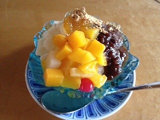 韓国のかき氷、パッピンス。「パッ」は小豆、「ピンス」はかき氷の意味。トッピングはフルーツ、小豆、餅、柚子茶、きなこ。もう秋だというのに、鬼喰い。