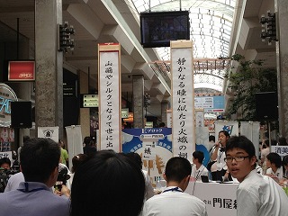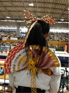 第5回書道パフォーマンス甲子園が四国中央市川之江体育館であった。四国中央市と言えば日本一の紙の町。映画「書道ガールズ!私たちの甲子園」の舞台で、昨年は大王製紙の不祥事で有名になったが…。特産品の水引をつけた地元の出場校。書道ガールの姪の誘いで、今年も早起きをし、車を飛ばしてやってきた。9時半の開会式にも関わらず、8時半には長蛇の列ができていた。「リハーサル中は中に入れません」という主催者側の意向で炎天下の中、帽子も日傘もないまま陽に焼けるに任せていた。今年は出場校が15校から19校に増えており、その中には思いがけず母校の名前があった。母校の入場行進。オレンジのつなぎを腰でしばって快活な感じ。演技は「お願いします」の掛け声で始まる。タテ4メートル×ヨコ6メートルの紙に歌やBGMに合わせて6分間でメッセージを書き上げる。パフォーマンスを競うので、どちらかといえば、書道の技術よりメッセージの内容や伝え方に重きが置かれる。よって、ミュージカル風だったり、オールディーズ風だったり、夏祭り風だったりと個性が光る。今年は、真っ白な仮面をつけて演技をした松山東高校が強く印象に残った。メッセージの内容も、昨年は東日本大震災の直後で、絆や命に偏っていたが、今年はバラエティーに富んでいて、高校生の目線の先にあるものが垣間見え、何度も胸が熱くなった。 前回、前々回と連続優勝の大分高等学校の作品。紺鼠(こんねず)のはかまに色鮮やかなたすき、黒髪を一つに結んだ清楚なスタイルは今やお馴染みになった。膝でリズムをとりながら書き進む様子は、まさに書道ガールズ。誰もが優勝を信じて疑わなかったと思うが…結果はともかく、高校生の暑い夏はひとまず終わった。