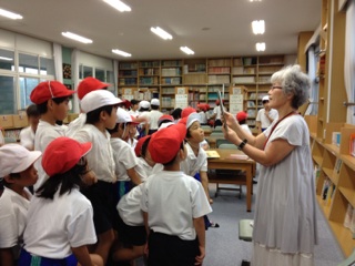小学校の図書室で読み聞かせのボランティアをした。二人で交代に4冊。子供たちは、話に集中するとズンズン前に押し寄せてくる。子供たちの熱気と、梅雨の湿気でダラダラの汗をかいた。パートナーが読んでいる姿をパチリ。