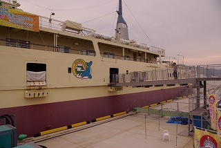 新居浜港黒島第2岸壁に羊蹄丸を見学に行った。昭和の高度経済成長を彩った旧青函連絡船だ。船内の一角に昭和30年代の青森駅の様子がジオラマで再現されていた。人形の表情がおおらかで楽しげな感じ。そういう時代だったんだろうなぁ…なんて。操舵室。船の頭脳ともいうべきところだけれど、やっぱりのんびりした感じで、古色ムード。今後、香川県多度津町の港に曳航(えいこう)され、解体されて、いよいよ長い歴史に終止符が打たれるという。実のところ、宇高連絡船ならともかく羊蹄丸には何の思い出もなく、興味もない。今回の目的は、『黒島』というロケーションにあった。まだ幼稚園にも入らない頃、このあたりに住んでいた。新居浜市内からバスで帰ると停留所のわきの店で必ずアイスを買ってくれた。「お利口でした」のご褒美がもらえるほど不便なところが黒島だったのだろう。塩田を眺めながら、大きな犬を連れて(連れられて?)散歩をしていた記憶がある。近所の大人が褒めてくれるので、磁石を引きずって、わずかの砂鉄を集めて歩いていた。この頃、住友の人のために海上の飛行場があった。父の背中におぶさって泳いでるすぐそばを、プロペラ機が離発着し、大きく海を揺らした。今や、黒島は埋め立てられ、整備されて、ずいぶん立派になって、わたしを思い出の世界には近づけてくれない。