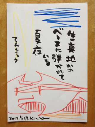 月に一度Jazz句会がある。毎回テーマが決められている。テーマはアーティストだったり、アルバムだったり、曲だったり。今月は3日に開催されたコンサートがテーマ。プロモーターが句会のメンバーなのでその時の音源を聴きながら、映像を観ながら、お酒を飲みつつ、感動を語り合う素敵な時間。あぁ、ピアノのメイバーンさん最高だった76歳なのに子供の様に楽しそうにプレーしてた。ここまで無邪気に音楽を楽しめるようになるにはたくさんのドラマがあったんだろうなぁ~なんて。Jazz史に残る凄いプレイヤーだそう。ファンキー今回の一番句(一番人気のあった句)は 銀盤に薫風のある黒き指私の句は二番句。特別に俳画をつけてくれた。今回のツアーを制作した伊藤八十八プロデューサー(渡部貞夫さんを育てたことで有名な方)が、来年のツアーも約束してくれたってお知らせがあった