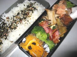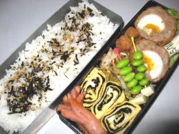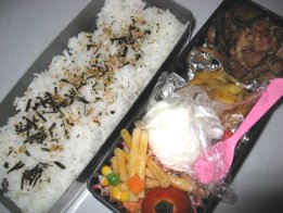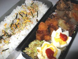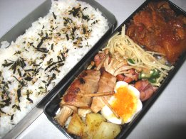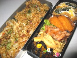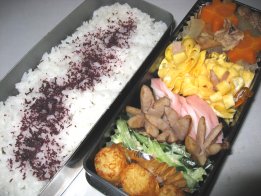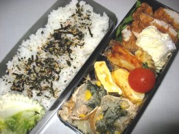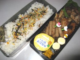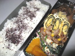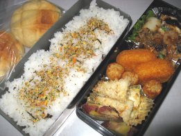 昨夜(というか今日の明け方)は2時にみいちゃんが「おしっこ~」って。おねしょしないとこがえらいけど、眠いのにトイレまで連れて行ってそして4時と5時半にきらちゃんの授乳・・・。ということで次に起きたら7時半あわてて上二人を起こしました。いつもはちいちゃんが起きてくるんだけど、昨日遅かったからかな。・そばめし・宝卵・カニクリームコロッケ(冷食)・☆魚ソーセージ・竹の子の炒め煮・もちもちごまかぼちゃ昨日の残りご飯が少しだったので久々にそばめしに。焼きそばについていた青海苔の他に、少し油でかりっとさせた花えびをかけて、ちょっと味のグレードアップをねらってみましたちいちゃんが「パパのお弁当って豪華でいいな~」って言うから「あんたも中学生になったら、ママの豪華なお弁当やで」と私。そしたら「じゃあ、ママって5個お弁当作ること、あるんやないん?」・・・確かに。ちいちゃんが中1ならひかちゃんが中3、そしてみいちゃんが年長、きらちゃん年中のはず。ひえ~ま、すごい先の話・・・でもないか、あと数年ですね。