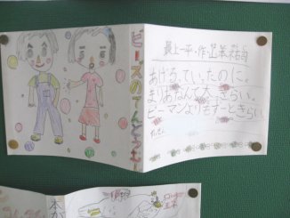 今日は寝坊して、朝起きたら7:30だから2時すぎからの授業参観を考えて、みいちゃんに早めのお昼寝させるには、少し外出しないと、と思って、近くのナフコっていうホームセンターへ。みいちゃん用の絵本が和室にたまりだしたので、何かケースが欲しかったし。洗濯かごみたいなのをイメージして行ったんだけど、カラーボックス用の収納BOXを見つけて。980円。楽天には同じものはないけど、こんな感じのもの。不要なときに畳めるし、紙製じゃなくて布で丈夫そう。気に入った黄色系水玉模様のが、店内で例として使ってるものしかなくて、少し底が汚れてたんだけど、(家で拭けば取れそうだったし)それがいいって言ったら、店員さんが2割引きにしときますねって。ラッキーでしたそろそろ衣替えに備えて、ムシューダや防ダニシートなど、細々買っていたら、きらちゃんがスリングで寝てしまいました。家についたらいつものように起きるだろうと思っていたら寝たまんま。お昼用意して食べようという頃に起きてきたけど、みいちゃんが眠くなった頃にはミルク&おっぱいしても眠くならず、ひとり遊んでました。ということで、私は寝そびれたんだけど、ま、みいちゃんが1時間ほど寝てくれたので良かったですもちろん二人乗りベビーカーで行きました。下駄箱外に開いたままストッパーだけかけておき、荷物を軽くするため、何かのときの着替えなどはベビーカーに残しておきました。今年だけ、上二人とも3階の教室なので、階段の上がり降りをしなくてすむのがありがたい。だもんで、二人の教室を行ったりきたりしました。みいちゃんは機嫌よく廊下を走り回ったり、教室のねーねたちをのぞきこんだり。きらちゃんはスリングで寝てしまい、授業終わるまで寝てました。授業の終わったパパがそのうち来てくれたので、みいちゃんは任せて、廊下で他のお母さんたちと交流しつつ参観授業はちいちゃんは国語。『ちいちゃんのかげおくり』って戦争の話。手をあげるって言ってたくせに挙げてなかったので後で聞いたら、「ママもパパもいないときに手挙げて発表した~。だって緊張するもん」・・・だって。何のために見に行ってるのやらひかちゃんは算数。小数の割り算。42mのひもを5.6mずつ切って縄跳びを作ったら、何本出来て、何m余るか?という問題を皆で一緒に考えるというようなもの。最近、算数のこういう問題に思いっきりつまづいてる感じなので、他の子たちはどうなのかしらと気になってたんだけど、みんなやっぱり難しいらしい。ちょっとほっとしたりして。パパに下二人をお願いして、一人残って懇談会にも参加。5年生のクラスに30分ほど参加してから、3年生のほうに。どちらもいろんなお母さんたちの話が聞けてよかったです。帰る前に、ちいちゃんの作品(本の紹介を書いた「おび」)が階段に張り出されてたので、それだけパチリ字を1つ1つ色変えたりしてるのがキレイで、ちいちゃんらしいわ。