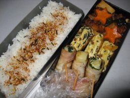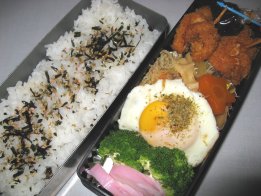 昨夜パパが買ってきたスターバックスのコーヒーを飲んだのに、下二人がなかなか寝なかったので寝かしつけてたらやっぱり寝てしまい。4時のおっぱいで完璧に目覚めたので、ハリポタ読んでたらあっという間に7時になってました。今朝は旗持ちでばたばた。今頃眠くなってきたので、きらちゃんさえ寝てくれたら一緒に寝ようっと。・ご飯(昆布入り)、ふりかけ・キャベツ&ヒレカツ、とんかつソース・じゃがいもベーコン巻き・ウィンナ・うずら卵ピック・ブロッコリグラタン・鶏団子のトマトソースヒレカツは先日作った残りを冷凍しておいたもの。鶏団子のトマトソースは、昨日ちゃんこ鍋に使った鶏ひき肉の団子の残りをトマトソースでリメイクしました。