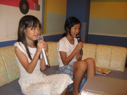 ykcatさんとこで見た『キッズルームのあるカラオケ』の話を先日上二人にしたら、「行きたい、行きたい!」っと、連休の間にすっかり行く気になってしまいました。土曜はRICや公民館行事、日曜はご近所で一斉清掃があったりしたので、今日に。・・・でも今日はパパの誕生日。パパはカラオケ嫌いなので、パパが歌ってるとこを私でも見たことないくらい。誕生日にパパを残して送迎だけさせて、皆でカラオケに行くってのもひどいかなと、私は違う日にしようよと言ったんだけど、パパは一人のんびりしたかったから、全然構わないって。ということで店の開店時間の11時に着くように送ってもらいました。店の前に人が並んでて、ひぇ~って思ったけど、高校生くらいの子ばっかりで、キッズルームは空いてました。歌う上二人。にっこにこで遊ぶみいちゃん。机にあがってきちゃった下二人。大好きな『さんぽ』の曲で行進するみいちゃん。マイク持たせてみたんだけど、歌うのはだめみたいでした。私は上二人がさびだけでも知ってるような、爆風スランプ「Runner」、ZARD「負けないで」、ユーミン「守ってあげたい」といった曲を。上二人は中嶋みかの「LIFE」が歌いたいって、3回も4回も歌ってました。時間帯がお昼をはさむので、もともとここで食べて帰るつもりだったので、適当に頼んで食べましたが、高いですね~。そんなにたくさん入ってもない、ジュース1つで290円だなんてジュースは1つだけ頼んで分けて飲みましたよ。今度行くときは、軽く食べてから行って、軽食するくらいにしようっと。上二人、とても楽しかったようでまた行きたいって言ってるし。帰ってからは私はきらちゃんと爆睡。夕方起きてから、パパにクッキー、ケーキ生地焼いて、夕飯作ってと、ばったばた。パパと娘たちケーキの仕上げは上二人がしました。今日はイタリアンスポンジってレシピを使ってみたら、ふわふわで好評でした。昼寝しそこねたみいちゃんは、夕飯食べてる途中で船こぎだして、あわてて、上の写真だけ撮ったら、そのあとすぐ寝てしまいました。^^;
