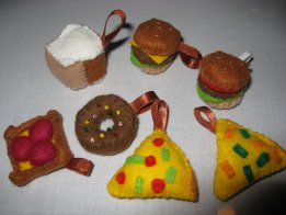 そろそろ小学校バザーに出すものを作ろうと、昨日から手芸にいそしんでます。給食袋など、役に立つ袋物も作ってるんですが、誰かがテレビ見てたりして、ミシンを使えないときは手仕事で出来るものをと思って、こんなものを作ってます。いろんな形のパン(バーガー、ピザ、ドーナツもあるけど)のマスコット。ひかちゃんやちいちゃんには「かわいい~」ってとってもウケがいいので、たぶんバザーでも女の子たちが楽しんで買ってくれるかな?以前バザー委員をしてたとき、「役に立つものばかりだと、バザーがつまらない」って誰かが言ってたの。こういうものがあると、見るだけでも楽しいよね。ずっと前に図書館で借りた手芸本に載っていて、いつか作ってみようとコピーしておいたんだけど、やっと日の目を見ました。まだフランスパンやメロンパンも作ってみたいし、本にはないけど、ケーキも作りたいなぁ