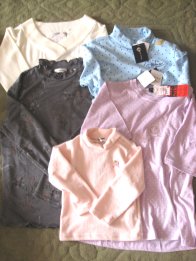 今朝、みいちゃんときらちゃんの衣替えをしました。明日はひかちゃんとちいちゃんのをしないと。どうも、夏の間にまたメキメキ背がのびたひかちゃんは、150の服がモノによっては丈が短い・・・どうも160に変えていかないといけないよう。ということで西松屋は130までしかないし、パパにしまむらに連れてってもらうことにしました。そのしまむらはすぐ近くに西松屋もあるし。しまむらで買った服でもひかちゃんはキャンプ疲れか、喉が痛いとかダルイとかぶつぶつ言って、あまり服を選ぶのに乗り気でなく、水色の水玉の長袖だけ。左の白のVネックは、いちおう自分用だけど、ひかちゃんが着ても。私は長袖ってボーダーが多いので、今回落ち着いた花柄を買ってみました。薄紫水玉の半袖Tは処分品で300円だったのでついつい。前の95ピンクはみいちゃんに。いちごのワンポイントがかわいい。ちょっと肉厚で着るのはまだ先だろうけど、着心地良さそう。そして西松屋へ。70のカバーオールはきらちゃんに。厚手で冬物だからまだ先だけどね。バックにもプリントがあってかわいい。798円なら、1シーズンでもいいよね。95の長袖Tはみいちゃん。いちごがいっぱいですごく喜んで、帰ってからさっそく着替えてました。袖がまだ長いので折って。これならもう1シーズン着れそう。薄手の長袖が意外に少なかったので、いいのがあってよかったです。399円だしね。あとシンプルな10枚入りガーゼと、かわいい5枚入りガーゼを。下二人にいっぱいガーゼ使うから、しみがいっぱいだったり、手触りの悪かったりするガーゼばかりになってきたので。これは昨日の夕方に近所の西松屋でちいちゃん用130のピンク長袖Tと長ズボン。ほんとはネットでちいちゃんの好きそうなのがあって欲しかったんだけど、最近お習字や図工のたびに取れないしみをつけて帰ってくる人なので、ためらってしまって。西松屋の700~800円くらいのなら、お下がりできなくてもまぁいいかと。今日は急に決まって、ご近所の宴会でした。秋田に出張だった人がおみやげにきりたんぽ鍋のセットを買ってて、それを使って。久々の宴会で子どもたち大喜びでした。夕方5時から始まって、きらちゃん離乳食&ミルクを済ませて行ったとはいえ、3時間まったく泣くこともなく、元気にはしゃいでてびっくり。9時にお先に失礼して帰ってきました。・・・でもさっきから興奮したのか時々夜泣きっぽく泣いてます。何度も起きないといいけど。
