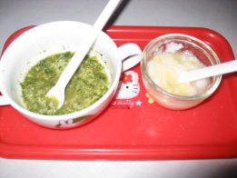ふと離乳食の様子を残しておこうと思い、写真を撮ってみました。今朝の離乳食卵黄入りおかゆ、金目鯛ムニエルを野菜でのばしたもの(キャベツ、ほうれん草、にんじん)です。おかゆは、もぐもぐする練習のため、粒をわざと少し残して裏ごししてます。まだ下の歯がやっと2本生えただけで、噛み切れないので、魚も野菜もみんな基本的には裏ごし・・・。これが手間かかって大変なんだけど。きらちゃんが食べている様子。右手で食べさせながら、左手で撮ってみました。このおかゆ、2/3は食べましたが、おかずのほうはだんだんとろみがなくなって食べにくくなったようで、1/4くらいかなついでにみいちゃんがお昼食べてるとこも。たいてい、こうやってお弁当の残りを食べてます。お弁当に使ったおかずが残ってないときは、ラーメンやミニうどんなど、思いっきり手抜きしてます。今日はおにぎりは半分だけど、おかずはほとんど食べましたついでのついでに・・・最近手に入れたおもちゃを。パパがUFOキャッチャーで(?)取ったらしい、ドキンちゃん後ろにひもがついていて、引っ張るとひもが戻る間、ドキンちゃんが震えて手に持ったすずがゆれて音が出ます。けっこうきらちゃんにウケてます。次に200円がちゃポンの3体。動きがテケテケとかわいいんです。ねじを巻いてから静かにおくと動き出さないので、みいちゃんは3体ともねじを巻いて置いてから、定規でペチペチ叩いて一斉に動かして遊んだりしてます。