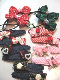 昨日作ったパッチンどめとリボンゴムです。ちいちゃんの誕生会に来てくれるお友達に好きなのを選んでもらうつもり。パッチンどめは使ってるところを見たことない子がいるというちいちゃんの情報で、リボンゴムも作っておきました。喜んでもらえるといいなぁ~。
