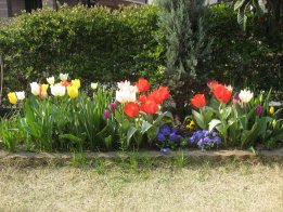 昨日、雨の予報だったのに晴れたので、突然いつものご近所5軒でのお花見が決定。6時半くらいから近くの公園に行って10時までやってました。5時過ぎに話が決まり、私は夕飯用に用意してあった2合分のご飯をいなり寿司とエビの手まり寿司に。そして圧力釜で赤飯を3合炊いておにぎりにして持って行きました。Kさんが8合分のおにぎり。Hさんがバーベキューの用意をしてくれて、他の人はお惣菜を買ってきてくれました。走り回っていた子供たちは途中上着脱いだりしてたけど、やっぱり空気が冷たくて。毛布とかいっぱい持って行ってましたが、寒い寒いと片寄せあって毛布にくるまって遊んでました。大人や大きい子たちはバーベキューの火の傍に集まって。桜はあと少しで満開といったところ。とてもきれいで、きらちゃんが上を見上げて「まま~みて~ぽわぽわ~」って。満開の桜の花ってぽわぽわした感じです、ほんと下に落ちたお花をひらったりしてました。今朝のお庭です。チューリップは前年度増えたもので腐ってなかった球根も一緒に植えてあるから、そちらはまだ咲いてないものもあります。5色特大球を買ったチューリップ、赤は確かに特大で見事なものです。他はまぁまぁ丈もあってよいのですが、紫が丈も低い上に小さい。安いのはこんなものなのかもしれませんね。チューリップといえば、31~1日にかけて、ハウステンボスに行く予定です。この人数ですので、コテージタイプのフォレストヴィラに泊まります。今そこでやっているというサーカスのチケットも取りました。とっても楽しみです。いい天気になりますように。