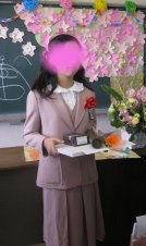 お天気にも恵まれ、いい卒業式でした。ただ・・・いたずらっこきらちゃんが絶好調で。とことこ歩きまわるわ、ごにょごにょ話するわ。しーんとした体育館に小さな声でも響くこと。しかも「お○ん○ん」という言葉をしきりに口にする!最近ちい&みいがふざけて教えていたらしいんです。慌てて口に飴を入れて防ぎましたが、まったく~。ビデオ撮ってる人がたくさんいたのに、一生残るかと思うと悲しいです途中で会議終わったパパが、ひかちゃんの卒業証書授与の少し前に、きらちゃんを迎えに来てくれてほっとしました。卒業生が一人ひとり、呼びかけみたいに言葉をつないで言う『別れの言葉』とか皆で歌う歌(校歌と『旅立ちの日に』)とか、とてもよかったです。各教室に戻って、それぞれ先生と最後のお別れ会。一人ひとり先生と握手して話をするので、順番待ちしてるときに撮った写真。ひかちゃんが着ているのが、前にも書きましたが、私が小学校の卒業式で着たスーツ。今の流行は黒っぽいブレザーに膝丈チェックのスカート、黒っぽい長い靴下、という姿みたいで、ほとんどがそんな服でした。周りは関係なく、古い型のスーツでもピンクだから気に入ったと着られるところがひかちゃんらしくて良かったような気がします。私は卒業式に着て行くのにちょうどいい服がなかったので、土曜日に一人でイオンに行って、すごーくベーシックな黒のスーツを買ってきました。ついでにパンプスとストッキングも。着慣れない服や靴で疲れて、お昼からぐったり昼寝してしまいました。昼からまた会議だというパパにせかされて、ゆっくり感慨にひたる間もなく終わって泣けませんでしたが、せつなさが胸に溜まっている感じです。ほとんど知らない人ばかりの中学校に行くことは私も不安ですが、強いひかちゃんのことなので、任せようと思います。