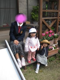 今日は中学校の説明会に行ってきました。パパに下二人預けて。パパがイオンに行くからと言うので修了式で午前中帰ってくるちいちゃんには鍵を持たせました。ひかちゃんと一緒にバスで行きました。時間を計るとバス亭まで6分、バスが15分ほど、バス亭からが15分ほどって感じ。向こうのバス亭からの道はちょっと寄り道したから、実際はもう少し早いかも。でもバス亭からの道が結構坂があるので、早くもひかちゃんはぶーぶー言ってましたさて、着いてすぐもらった資料の袋を開けると、春休みの宿題がいっぱいさすが。いろいろ学校生活についての説明を受けたあとで、物品購入。靴や教科書、あと合宿費用(5月に宿泊研修があるって)も払ったので、また5万ほど飛んでいきました。うぅ重い荷物をひかちゃんと分け合って持ちながらバス亭まで戻ったのに、バス定期の書類を受け取るのを忘れてたのに気がついたので、一人で走って戻って取ってきました。ふう疲れた。バス亭付近で待って、パパに迎えに来てもらいました。入学式はやはり”保護者同伴のこと”ということだったので、パパに入園式行ってもらうことに。きらちゃんは保育所の一時預かりに預けるつもりだったんですが、パパが入園式くらいなら連れて行けるというので任せることにしました。昨日庭で取った写真。ひかちゃん、みいちゃんはそれぞれ制服。きらちゃんは2歳児クラス指定のスモック&帽子。この格好でバスに乗ることになります。ちいちゃんが学校行ってるうちに撮ったから、3人の写真になっちゃった。またちいちゃんも入れて撮らないとだわでも昨日、きらちゃんが近所のやんちゃなSくん(今度小学1年生)に自転車でぶつかられて、目じりに傷が。4,5日くらいで治ると思うんだけど、それまでにチューリップが枯れないといいなぁ。Sくん、自転車はスピードを出して、みいちゃんやきらちゃんのすぐそばを通り過ぎることでスリルを味わうって感じだったので、危ないからやめて、って言ってたんだけど聞かなくて私はきらちゃんの目の前にしゃがんで、きらちゃんにシャボン玉をさせていて、自分ももう少しで当たるところで止めようがなく。仲良くしてるご近所だし、我慢して言わないでおこうかなって思ってたんだけど、すぐ後に帰ってきた奥さんに、ちいちゃんが言いに行ってしまって。もちろん奥さんとダンナさんとSくんであやまりに来てくれました。きらちゃんなら加害者になるのもありうる(先日みいちゃんの背中に噛みついて怪我させたし)ので、今度からSくんが気をつけてくれるならいいから、あまり気にしないでと。今度自転車ですり抜けるとこを見たら、もっと怒鳴りつけてやれそうだしね