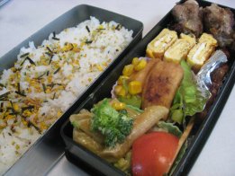 なんだか気分的な疲れが溜まってきてます。たぶんしなくちゃ~ってことがいろいろ済んでないせいかも。裾上げ、名前付けとかの幼稚園の準備がまだ終わってない・・・今日は頑張ってしよう。(ここで決意表明すれば動けるかと)・おにぎり3種・焼きうどん・関東炊き(昨夜残)・コーンフライ・鶏だんご串・ブロッコリ・アンパンマンポテト今日の夕方生協が来るので卵もなく、少しの豚肉を焼きうどんに使ってなんとかお弁当。キャベツがなかったんだけど、まぁ長ネギを多めに使って。焼きうどんなら下二人のお昼にちょうどいいこともあって。お弁当の寂しさはご飯をおにぎりにしてごまかしました関東炊きは牛すじ肉で炊いたおでん。濃い目の味付けです。昨日はちいちゃんのチャレンジ9月号の見直し(間違って○してる答えを見つけて直させる)をさせました。まだ10月~3月まであるわぁあまり間違いがなければすぐ終わるんですがね。やれやれ。実はちいちゃん、6月に英検5級を受けることにして、ここ2週間ほど英検の問題集を毎日3問ずつしています。ひかちゃんのときは、1ヶ月前から毎日5問させたんだけど、基礎の乏しいちいちゃんなので、早めに始めました。3問したあとに、問題に関連した単語を数個覚えさせるという風に。私と一対一の時間が持てることがうれしいようで、喜んでやってます。意外に読めるし解けるようになってるので、この調子でいけば大丈夫かな。ひかちゃんも、実はF校の受験日に重なってしまったために申し込んでいた4級を受けられなかったので、6月に受けると言ってますが、まだ勉強始めてません。ちいちゃんに触発されて始める気になればいいんですが。