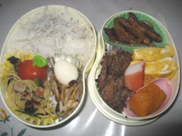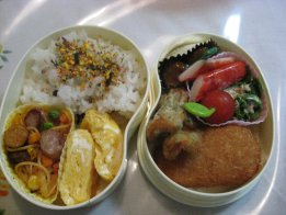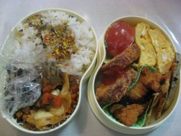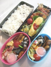 昨日の雨はあがったものの風がきついです。洗濯物いっぱい洗濯ばさみつけたけど、飛ばないかなぁ。・竹の子ご飯・オムそば・ウィンナ・みつせソースカツ・豚肉巻き(オクラ、長いも)・なすしぎ(パパのみ)・ツナきゅうりサラダ(パパ)orごぼうサラダ(ひか)・かにかま・ミニトマトパパは東京出張のため、出張弁当です。幼稚園は幹事会のため午前保育でお弁当なし。竹の子、大学で取れたのをゆがいてからいただきました。ゆがくのが大変だからありがたかったです。メインは豚肉巻き。オクラも長いももネバネバ系で体に良さそう。最近英検クイズというサイトを見つけました。ちいちゃんに時々5級のをさせてます。問題集を買わなくてすむし、1回10問で10分くらいで出来るのでちょうどいいみたいです。回答を送信すると○×の回答とともに何位かが出ます。今朝やったら初めて1番にランクインして喜んでました。ママと一緒にやったから実力じゃないけどね
