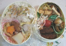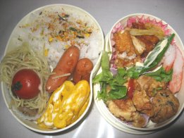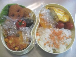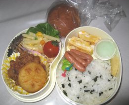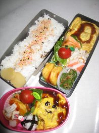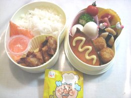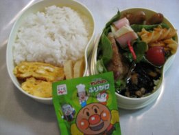 今朝は目覚ましが鳴ってから起きました。やはり疲れがたまってきてるようです。昨日お昼寝しておけばよかったんだけど、HDDの整理(溜まったアンパンマンをDVDに移す作業)をしてたらできなくて。・ご飯(昆布サンド)、ふりかけ・おでん風煮(がんも、ウィン名、大根、人参)・かにかま入り卵焼き・厚揚げとキャベツの炒め物・ごぼうサラダ・ミニトマト・ミニホタテのガーリックソテー・みつせ鶏ソースカツ今日はやや市販品利用度高し(ごぼうサラダとソースカツ)厚揚げとキャベツと舞茸をバター炒めしてから、焼肉のたれを。汁気が多いので片栗粉でとろみをつけました。今日の英語はパパが代車を借りてくれて、パパが行ってくれるそうです。先週眠い下二人を連れて、ちいちゃんとバスで行ったんだけど、かなり大変そうと思ってくれたようで。(ほんとに大変だったけど)ひかちゃんはまた中学校から直接。もう路線もわかったので大丈夫みたい。昨夜、アジアの主要な国名と首都名のテストがあるからとひかちゃんが覚えるのを手伝ってたら、自分も覚えちゃいました。でもパプアニューギニアの首都がポートモレスビー、なんて雑学に近いような。明日は中学校の保護者会があります。午前中びっちり。ゆっくり寝たかったのに、8時半に家でなくちゃお昼、なんか用意しとかないといけないかな~。幼稚園も登園日なので(土曜日月1回あり)、パパにバス停までの送り迎えを頼む予定です。きらちゃんが玄関で靴を履いて廊下をうろうろしはじめたので、公園行ってきまーす。