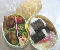 今日は遠足向きのいいお天気です。一緒に行く遠足なので、私もお弁当あり4つでした。・えび天むす・わかめおにぎり(ひかのみ)・焼きなす(ママ&ひか)・ちくわの蒲焼・ウィンナorミニウィンナ・コーンバター・キャベツのゆかり和え・オクラ&ハムのおひたし・ハムチーズ巻きorハム巻き・ミニトマト・うずら卵(ママ、みい、きら)ひかちゃん今日のパンはクリームパンです。うずら卵ひかちゃんに入れ忘れたわ。明日入れよ。えび天むす、ひかちゃんに最初2個入れたんだけど、やっぱり多いと言うので、朝1個食べさせ、代わりに小さいおにぎりを1個入れました。朝しっかり食べたからクリームパンは帰りに食べるかもね。