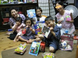 21日の夜、夕飯済ませて8時前に家を出発。すると昼寝なしだった下二人はぐっすり。トイレ休憩2回くらいで夜中1時すぎに実家に到着。思ってたよりラクでした。高速を降りるとこで「料金は千円です」の声を聞いて「おぉ~!」と思いましたが、温暖化のことを考えると複雑・・・新幹線とかに助成してほしいなぁ。とにかく全部パパが運転。お疲れさまでした。翌22日は妹の息子のまあくんと家で遊んだのち、夜に地域の地蔵盆へ。そこでビンゴがあり、たくさんの賞品をゲットしてきました。ゲットした賞品と記念撮影。ちいちゃんが持っているのは、本人が一番欲しいと思っていて当たったもの。スイッチを入れると上下する怪獣(?)たちを、ぺこぺこと叩いて獲る単純なものだけど、皆が遊べるのでよかったみたい。さっそく遊んでました。