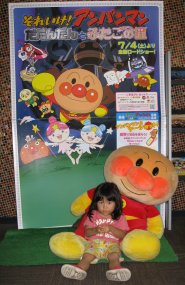 夜1時すぎに到着し、寝て起きたこの日、実家から送っておいた荷物が8:30に届きました。実家を出る前の夕方5時すぎに出したのに、はやっ!ウチのへんは集配所から近いらしく、8時に来ることもあるのよね。ゆっくり寝てて慌てることがあるから8時に起きてスタンバイしてました。さてこの日、昼からチケットが当たったアンパンマンの映画を見てきました。チケットには9月末までと書いてあってのんびりしてたのに、映画館調べたら8月28日までということだったので、実家行く前からこの日に行くと決めてたんです。皆疲れて朝が遅かったので、映画が12:20からだけどお昼食べてからというのは難しくて、オムライスとたこ焼きをテイクアウトして、私とひかちゃんがダッシュして持って行きました。でも映画が始まると館内は暗くて食べにくいのなんの。なんとか食べましたが、色が見えずに食べてもあんまりおいしくないものですね。みいちゃんとパパは後で食べることにして、映画に集中してました。きらちゃんはすごくお腹すいてて食べずに見るというのは無理そうだったので、たこ焼きを小さく切って口に入れてやり。大きなたこ焼き3個ぶんくらい食べて満足だったよう。私は自分が食べたり、きらちゃんに食べさせたりであまり映画に集中できなかったですが、1話目は笑えるシーンが多く、よくみいちゃんが笑ってました。メインの2話目もそれなりに。そういえばきらちゃんはこれが映画館デビューだったけど、終始楽しく見ることが出来ました。たこ焼きを口に持って行ったら食べるけど、目線はスクリーンだったもんね。出たところで記念撮影場所があったので。みいちゃんは入ってくれず、きらちゃんだけ。最近、眠くて機嫌が悪いと写真撮られるのをすごく嫌がるのよね。この日夕方からはご近所でのバーベキュー&花火。急に決まったのでおにぎりと冷凍の豆腐ハンバーグを焼いて持って行っただけ。みいちゃん、花火は好きなのでこの笑顔。