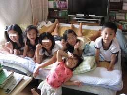 22日夜に塾の終わったYちゃんが到着し、お泊り。翌23日、このときいる孫たちで撮影。おじいちゃんが朝風呂に入るのに小さい組を誘ったら、まあくんと下二人は喜んで一緒に入って、楽しそうでした。おじいちゃんが写真撮ってって言うから撮ったけど、公表したら将来下二人にうらまれるよね午前中はお勉強。中2のYちゃん、数学はみてあげられるけど、理科は難しかったわ。フレミングの左手の法則、どこが何を表してるとか忘れてるし・・・。辞書で調べつつ一緒に考えたって感じお昼はおじいちゃんに2往復で送迎してもらって近くの商店街へ。妹はまあくんと家に帰り、他のみんなでマクドナルドで食べてからダイエーのゲームコーナー。大きい女の子たちはプリクラを2回も。私は下二人とリラックマのプリクラを撮って、赤外線通信で携帯待ちうけに取り込むというのを初めてやってみましたきらちゃんはベビーカーですぐ寝てしまい、私はきらちゃんのパンツ(かなりトイレに行けるようになったので)などを買い物したあと、少し一緒にゲームしたけど疲れたので先に帰りました。後から帰ってきた大きい組は時間を惜しむように忙しく遊んでました。実家の道場でバドミントンしたり、空手のツキや蹴りの練習で使う、吊り下げるもの(なんていうんだったっけ?)を3人で玉乗りみたいにしたり。夜10時すぎに姉が迎えに来て、明日が登校日というYちゃんは帰って行きました。短かったけど、なんか充実してたよね。