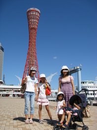 この日は朝10時くらいに姉が下二人の男の子連れてきて、1時間大人はおしゃべり、子供たちは遊びました。ウチがダンナの両親と外で食事することになってたので11時にバタバタとさよなら。今度来るのは年末年始かな?そのときはもっとゆっくり会いたいものです。車でハーバーランドに出て、かに道楽でご馳走してもらいました。かにの形の箸置きがかわいくて、下二人が相当遊んでました。写真撮りたかったけど、義父母の前で取り出しにくく。^^;かにのお刺身って初めて食べましたが、とろけるような感触で美味しかったです。量はダンナが食べきれないくらいって言ってたけど、下二人に分けてやりつつだと少し足りない感じでした。食べ終わったあとは私たちだけでポートタワーへ。私は小学生の頃登ったっきり。家の居間に飾ってあるトーマス・マックナイトのポスターは神戸の風景でポートタワーが描いてあるので、子供たちを一度連れてきてあげたくて。ポートタワー前で。眠いみいちゃんは機嫌悪くてベビーカーに。タワーの展望台にて。帰りに少しぶらぶら。阪急百貨店とモザイクの間にあるナミナミのエスカレーター。気に入っちゃった子供たちがわざわざ登って降りてと楽しんでました。買ったアイスを食べつつ、車で実家へ。私は途中の大丸で一人降ろしてもらっておみやげを買いました。6時ごろ家に向けて出発。8時ごろ岡山のサービスエリアで夕飯。母がもたせてくれたちらし寿司と焼肉に加えてラーメンを2つ頼み、食べました。しかし行きは食べてから車乗ったのでずっと寝てたきらちゃん。帰りは夕飯食べたら復活しちゃって、ちょっと大変でした。家に着いたのは1時すぎ。無事に帰ってこれてよかったです。