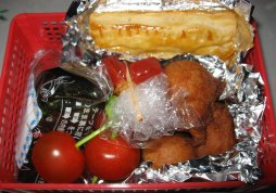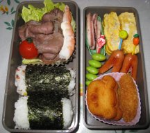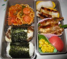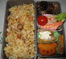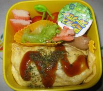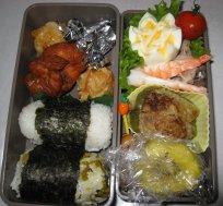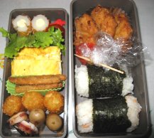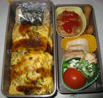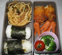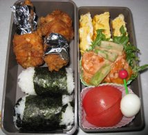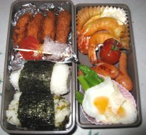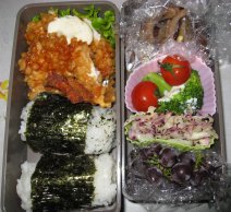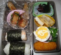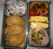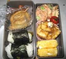 よく晴れてます。だからマット類を洗って干してます。・おにぎりorご飯・宝袋(昨夜残、パパ、ひか)・ウィンナ・エビマヨ・豆腐ステーキ・卵焼き・ミニトマト・紅茶煮チキンハム(昨夜残、パパ)・アボカド(みい、きら)宝袋はウチのエコ料理。さしみのツマをすし揚げに入れてめんつゆで煮ます。今回は切った水菜とミニおもちを一緒に入れました。エビマヨはやっとコンデンスミルクを買ったのでだいたいレシピどおり。アスパラじゃなくて枝豆だけど。コンデンスミルク入れるとこってり感が出ますね。豆腐ステーキ、もめん豆腐ではないけどなんとか出来ました。ちょっとくずれたものもありますが。お昼、生協の役員の方に誘ってもらったので、店舗での試食会に行ってました。カタログの水産加工品を扱う会社”オーニシ”の方々がみえて、製品の説明や調理法の説明などもあり、とても参考になりました。例えば、冷凍のカレイを解凍したあと、水気をふき取ってから煮つけにするとくさみが出なくなるとかね。みいちゃんの好物のしめさば、今日は巻き寿司の中身でいただきました。紫蘇ときゅうりも入ってて、なかなか美味しかったです。一番ヒットだったのは「いかのたつた揚げ」やわらかくて食べやすいので、今度カタログに載ったら頼もうと思いました。実は昨日の夕方にお向かいのあーちゃんちのおばあちゃんが亡くなられました。あーちゃんのご両親は共働きで忙しいので、近くに住んでるそのおばあちゃんが、よく洗濯や掃除などのために、お向かいの家に通ってらして。朝下二人を幼稚園バスに連れていくときが、ちょうど来られるタイミングみたいで、よくお会いしては挨拶したり、いろいろおしゃべりしたりしてました。運動会や陸上クラブのイベントのときはいつも差し入れを持っていらしてて、ウチの子たちにも差し入れのおすそ分けをくださったりした方でした。こないだの運動会はおみえでなく、ご病気なのは知ってたので悪くなられたのかなと思ってた矢先でした。よくお会いした方が、もう二度とお話できなくなると思うと悲しくて・・・。今日は夕方からお通夜です。家族皆でお焼香行くのはもちろんですが、受付を頼まれたので先に行く予定です。夕飯はカレーにしたからパパでも食べさせられるしね。