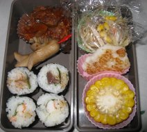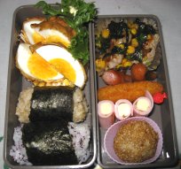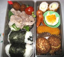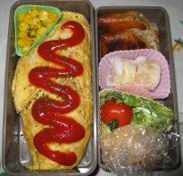 梅雨らしくじめじめ曇ってます。今日は降水確率50%だそう。降ってはないけど外には干せなさそう。・おにぎりorご飯・ゆで卵の変わり揚げ・キャベツハンバーグ にらコーンソース・ウィンナ・コーンフライ・ハムチーズ巻き・ごま団子(昨夜残、ひか)・きゅうりの金山寺味噌和え(パパ、みい、きら)・なす豚炒め煮(昨夜残、パパ)ハンバーグ、レシピではキャベツじゃなくてもやしだったんだけど、なかったので代用。ソースもレシピではニラだけだったけど、下二人が見た目でひきそうだったから、コーンも加えて。朝食べたちいちゃんが絶賛してたのでレシピを簡単に。豚ミンチ 300gに、ざく切りキャベツ(もやし)、片栗粉大2、おろししょうが大1、塩コショウ加えて練り混ぜ、ゴマ油で焼く。ソースはゴマ油でニラを炒めてから、湯1/2c、中華スープ素小2、オイスターソース大2、酒大2、片栗粉小1/2を加えてひと煮。ゆで卵の変わり揚げは、せっかくやってみたけど衣がしけってしまうからお弁当向きじゃなかったです・・・でもかりっとした衣なら青海苔も利いて美味しいので、普段の夕飯とかでまたやってみよっと。ごま団子はひかちゃんがすごく気に入って、また作ってってうるさかったので昨日作ったんですが、残ったのを入れていきたいというので。土曜日、学校説明会に行ってきました。ちいちゃんは英語の体験授業を受けました。OHPを使ってフォニックス読みの練習から始まって、好きな色、食べ物、スポーツなどの聞き方、答え方など。でっぷりと体格のいい外人先生がユニークで保護者にも「What color do you like ?」とか聞きにきたり、なかなか面白かったです。ちいちゃん的には理科の体験授業だと再生チョーク作りが出来るのでそっちに行きたかったらしいですが、選べなかったので。最後にパンとジュースをもらって帰りました。受験を挟んで無駄にする時間がなくなるぶん理科や社会の実学に充分時間が取れるとか、学力の足りない子がいないのでスムーズに授業が進められるとか、なかなか私学の良さを上手にアピールしてました。私もひかちゃんは「皆やさしい子ばかり」って楽しく通っているし、たぶん公立行ったらこんなに勉強してなかったろうなと思うし、実際先生方が熱心できめ細やかに対応してることには感心してます。すっかり洗脳されてしまったかな(笑)しかし、ああいうところに行くと緊張して疲れます。お昼食べてから2時間くらい寝てしまいました。ちいちゃんも1時間くらいお昼寝したって。そのぶん、昨日はのんびりしていました。