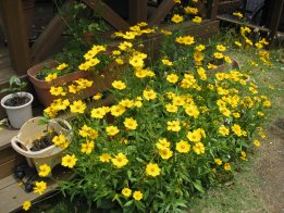 久々にガーデニングの話題。いつも夏の花壇はポーチュラカメインなんだけど、今回は大輪のビンカにしました。去年苗をもらったのを鉢植えにしてたら、花期が長くて丈夫で良かったので。3つ買って上をカットして差し芽。うまく増えるといいな。ピンクのバーベナも1つ。これは花壇の真ん中に、まだ少し残ったパンジーなどと一緒に。でもまだ花壇の半分がスカスカ。かわいそうな伸びきったクリーピアが1つ30円で売ってたので、なんとか再生させてやれるかしらと2つ買ったんですが、いきなりこの花壇には無理。土は固いし虫は多いし。とりあえず鉢植えにしてやってます。うまく元気になって花壇に入れられるといいんですが。トイレの窓辺に飾ってる観葉植物も1つ枯れたので、ヒポエステスっていう斑入りの葉のを。あと青紫蘇の苗とみいちゃんが喜ぶのできゅうりの苗を2つ。先日読んだ絵本できゅうりを育てる話があって、やりたがってたんです。冬越ししてよく増えている大輪の松葉ボタンをブランコ横のよく日の当たる2段コンテナに入れました。これはあまり水やりしなくても強いからここにぴったりかも。買ってきた花たちを撮るのを忘れてました。植えるときはいつも、根が先にしっかり張るために花を取っちゃうので植えたところを写してもイマイチ。また花が咲き始めたらアップしたいと思います。今の庭はオオキンケイギクが花盛りです。左にあるプラの鉢植えはちいちゃんが育ててるびわの苗です。ウチのびわから落ちた種から勝手に発芽してた芽があって(葉っぱの形でわかる)育てたいと言うので。これだけ水遣りしたりしてます。結婚するとき持っていくんだって(笑)