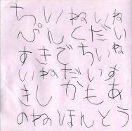 みいちゃんが折り紙の裏に書いた文が面白かったので「”ぴ”ってどうやって書くと?」って聞かれて「ひかねえねの”ひ”に○をつけたらいいんよ」と言ったら「そっか~初めてわかった」って。「ちいねいね ぴんくだいすきで ちいねいね だいすき しかも あのね ほんとう」と書いてます。「しかも あのね ほんとう」がいいよね