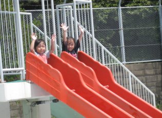 昨日プールに連れてってあげようと思ってたら、大きな音で雷が鳴るので、音に怖がるきらちゃんにはとても無理。今朝はいい感じに晴れていたので、午前中行ってきました。いつも同じだと飽きるかと思いたって、いつもの児童プールではなく、すべり台のある市民プールへ行ってきました。パパに行き帰り送迎してもらって。こっちは私も入らなきゃいけないんだけど・・・。行った早々、みいちゃんと遊んでて目を離したすきに、きらちゃんがうきわのままひっくり返って溺れそうになるというハプニングがありました足入れるタイプのうきわは、ひっくり返ると怖いことになるので注意しなくちゃいけませんねでもすべり台に大喜びで何度も滑ってたので行ったかいがありました。これはバンザイで滑ろうとしてるとこ。みいちゃんは派手にしぶきをあげてばしゃっと行くのがお気に入り。きらちゃんはまだそれは無理で、足で少しずつ速度を落としつつこちらのプールはほとんど日陰がなくて、途中で端っこだけ日陰になったのでそちらに移動しましたが、また焼けたかしらね。さて、明日から新学期です。下二人はそろそろ家にいるのも飽きたので幼稚園に行くのはうれしいみたい。ひかちゃんはあと数学が少し残ってるのをやってます。ちいちゃんは自由研究、鉛筆での下書きは終わったけど字を書くのが遅いので、清書がなかなか進みません。すぐ途中で気がそれて遊ぶしねぇ。はぁ。明日はいきなり幼稚園の役員の集まりがあるそうです。運動会の買出しについての話し合いだそう。お昼何か作ってから行かないと。