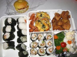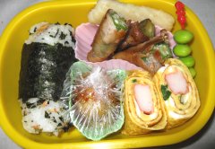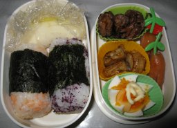 中学校の運動会でした。お弁当はこんな感じ・えび天むす・海苔ふりかけおにぎり・トンカツ巻き寿司・ウィンナ・キッシュ・唐揚げ・ブロッコリ・うずら卵・にんじんグラッセ・冷凍グレープフルーツ、オレンジフルーツ類を写すの忘れましたが。剥いたものを冷凍して、クーラーボックスで持って行ったらお昼まで溶けてなかったので好評で、「また来年もしてね!」って。ちょっと目新しいモノをと思って、ベーコン、ほうれん草、玉ねぎを入れたキッシュを作ってみました。でも家にあると思ってた冷凍パイ生地がなくて・・・アルミ容器にくっついて食べにくいと不評。6時に目覚ましかけたのに5時に目が覚めてしまったので、かぼちゃベーグルも焼きました。朝、トンカツの残りやハムを挟んでサンドイッチに。でもひかちゃんは間に合わなくて、昨夜焼いてたふわふわパンを・・・って思ってたのに、クリーム挟んだくせに持っていくの忘れてたのを後で発見。結局朝食べずに競技やってました。競技の話は別記事にて。